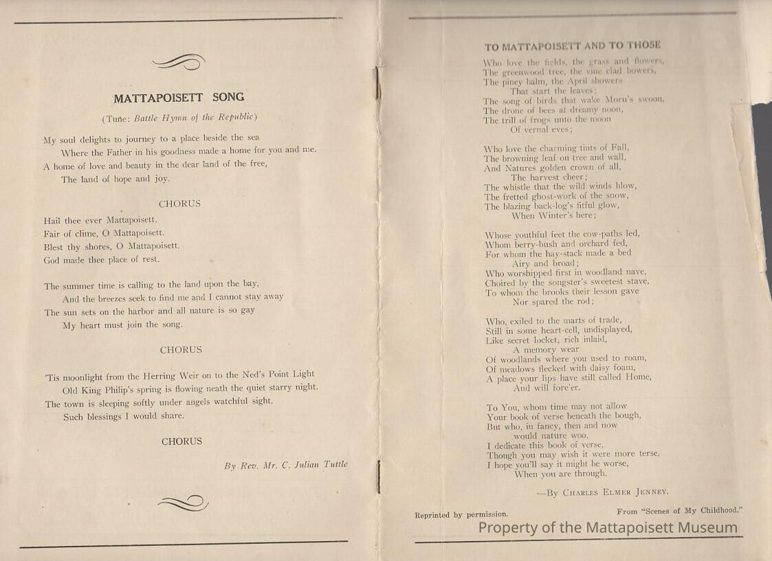 Booklet with Mattapoisett Song, by Rev. Mr. C. Julian Tuttle, and To Mattapoisett and to Those, by Charles Elmer Jenney.Collection