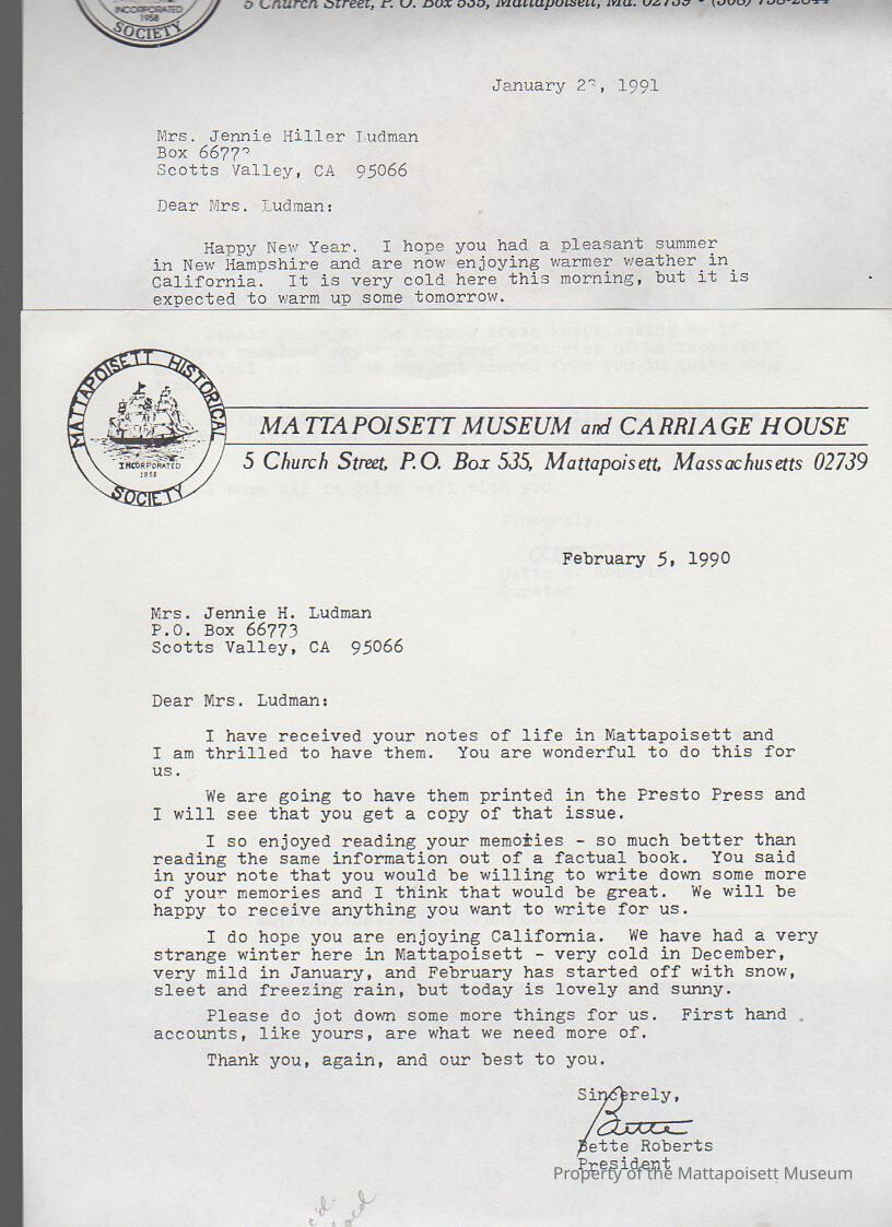 Correspondence between Bette Roberts at Mattapoisett Musuem and Carriage House and Jennie Hiller Ludman.Collection