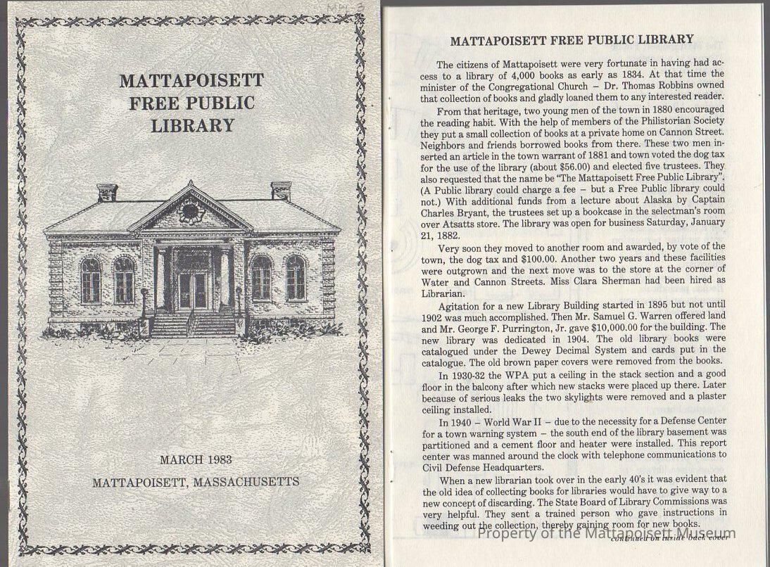 Booklet of the Mattapoisett Free Public Library. Two (2) copies.Collection