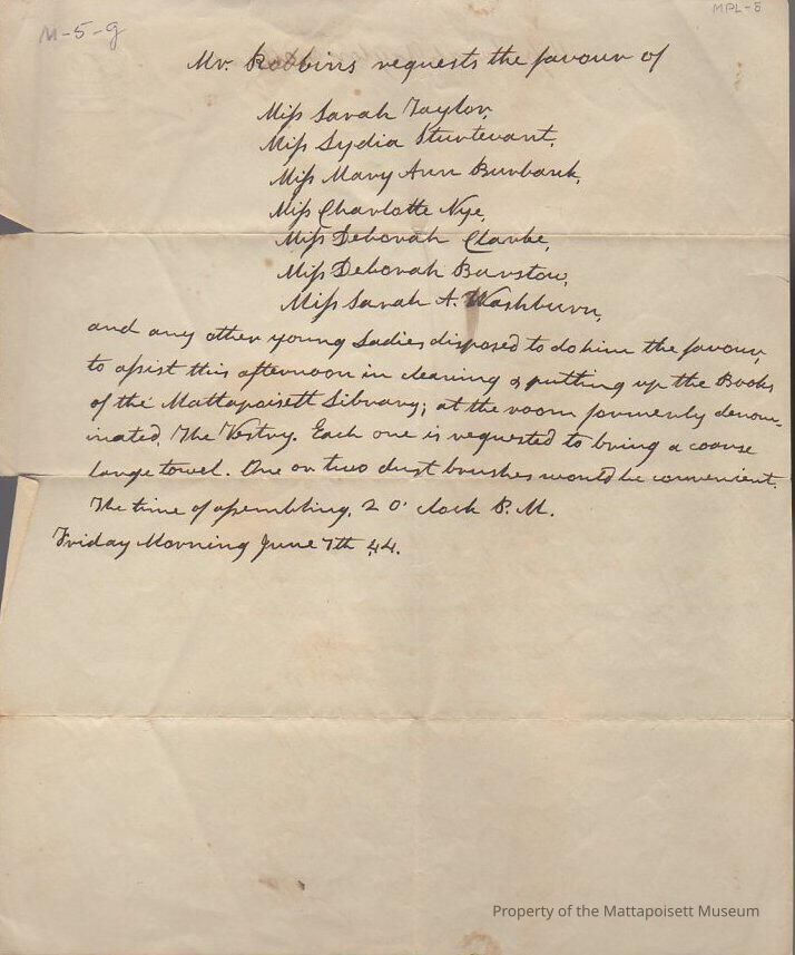 Invitation of Mr. Robbins to "young ladies disposed to do him the favor to assist this afternoon in cleaning and putting up the books of the Mattapoisett Library, at the room formerly denominated the Vestry.Collection