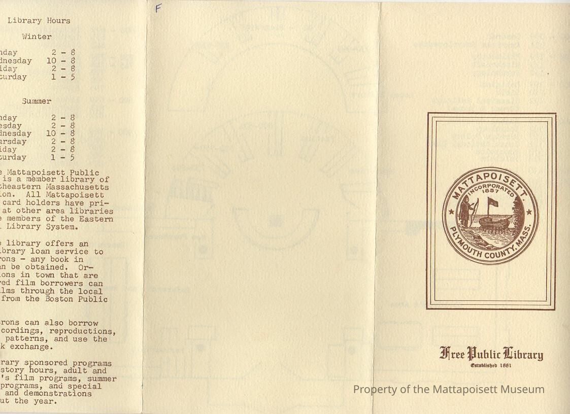 Pamphlet for the Mattapoisett Public Library. Hours, history, layoutCollection