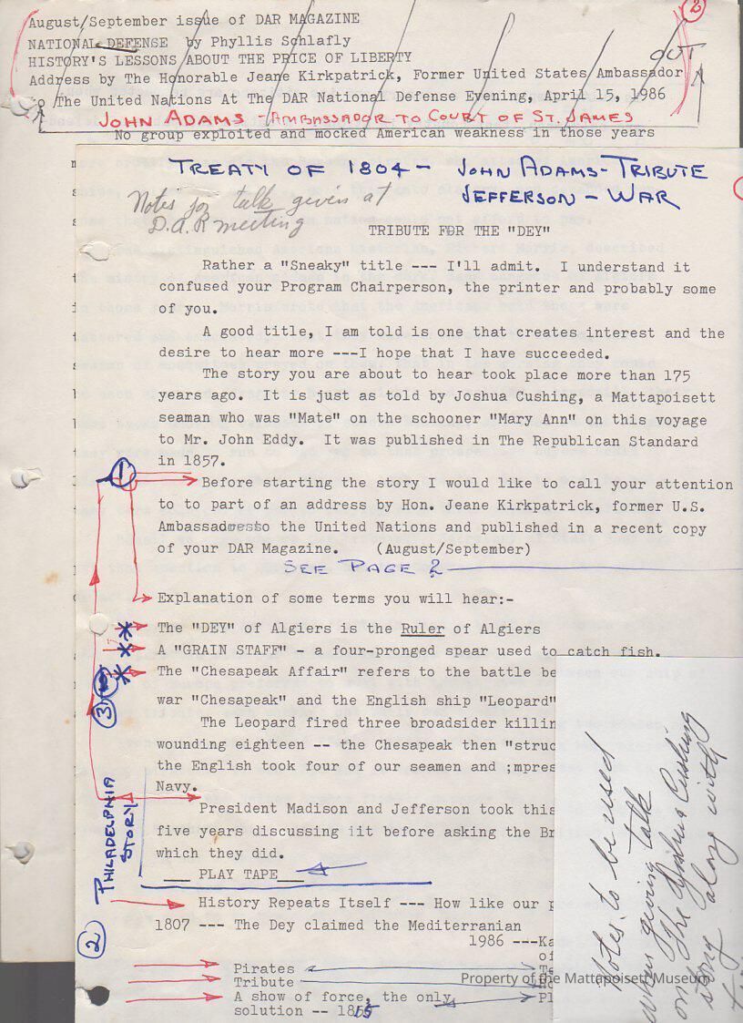 Notes for the talk given at D. A. R. meeting, Tribute for the "Dey".Collection