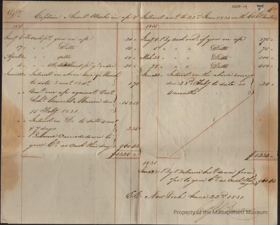 Accounting page for Captain Ansel Weeks in account and interest with C. & J. Barstow.Collection