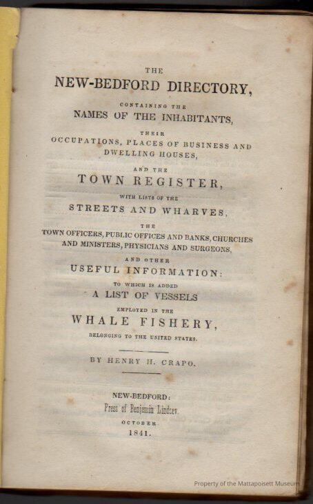 The New Bedford Directory, containing the names of the inhabitants, their occupations, places of business and dwelling houses and the town register with the lists of the streets and wharves...and other useful information; to which is added a list of vessels employed in the Whale Fishery. 1841.Collection
