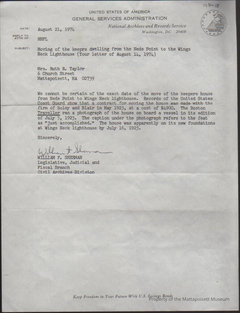 Letter to Ruth R. Taylor from William F. Sherman, Legislative, Judicial and Fiscal Branch, Civil Archives Division RE: Moving of the keepers dwelling from the Neds Point of the Wings Neck Lighthouse (your letter of August 14, 1974).Collection