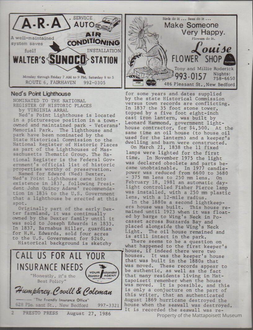 Presto Press Vol. XXXII, No. 34, article "Historic Ned's Point Lighthouse", Nominated to the National Historic Register of National Places.Collection