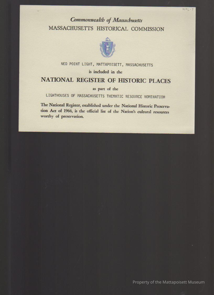 Certificate from Massachusetts Historical Commission naming Ned Point Light, Mattapoisett, Massachusetts as included in the National Register of Historic Places as part of the Lighthouses of Massachusetts Thematic Resource Nomination.Collection