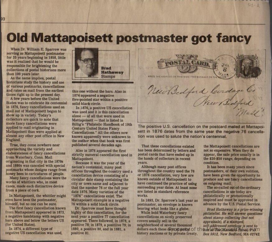 Standard-Times article "Old Mattapoisett postmaster got fancy". Dr. William E. Sparrow 35 years starting in 1858Collection