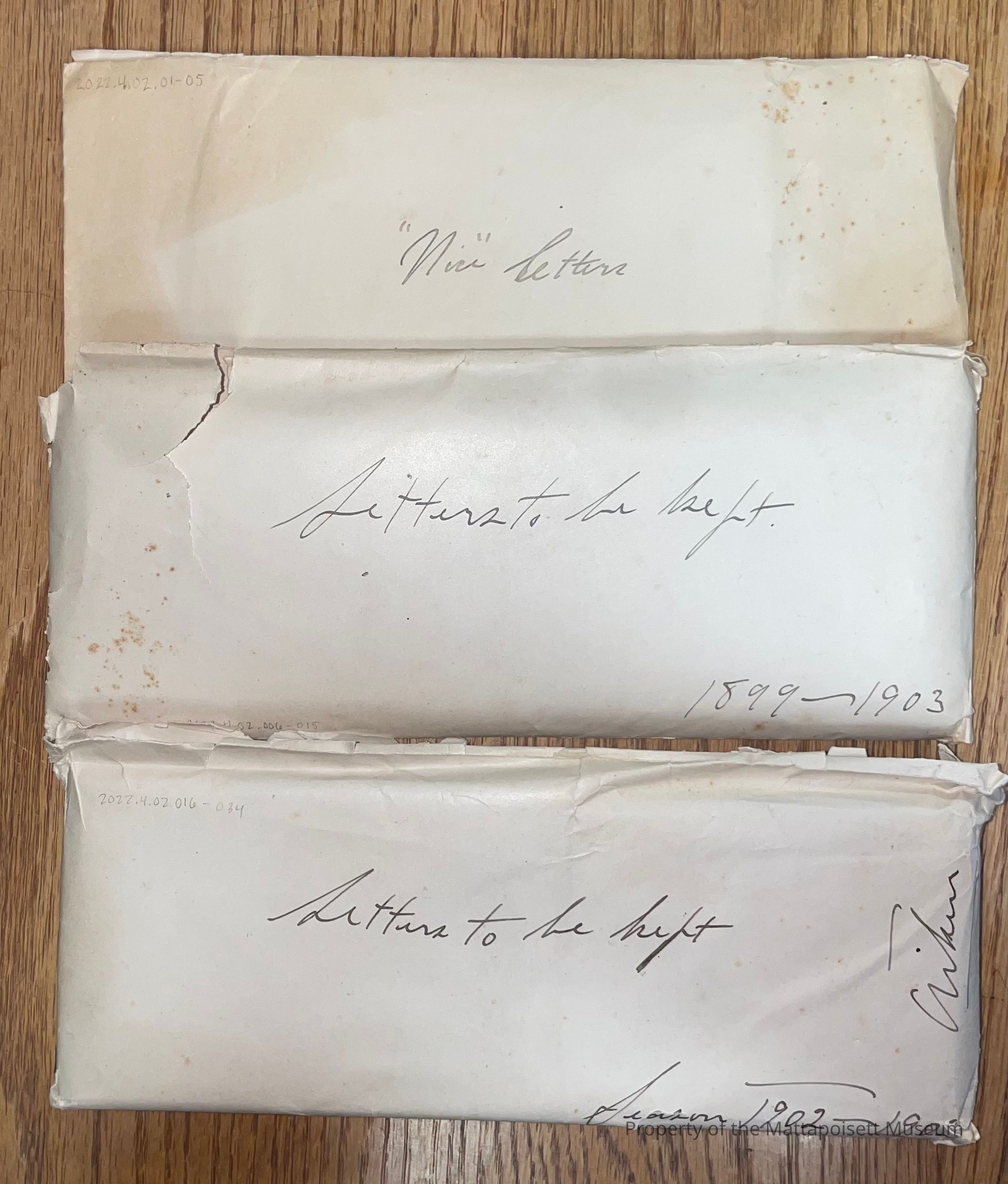 The envelopes are titled: "'Nice' Letters," "Letters to be kept 1899-1903," and "Letters to be kept, Aiken, Season 1902-1903." They contain letters from friends and family members such as George's mother, Aunt Emma, William Dresser, and George's father (C.C. Harrington). The subject matters include troubles with book publishing, Christmas gifts, horse boarding, and Doctors' notes.Context