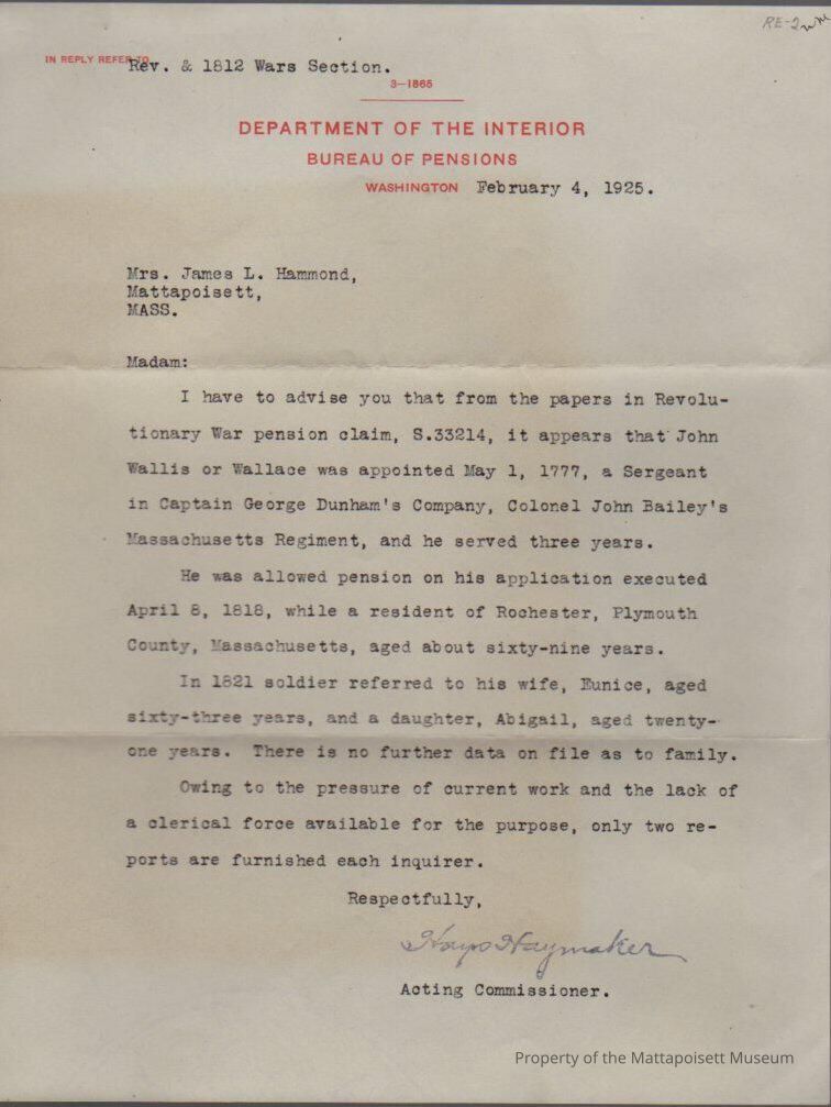 Letter to Mrs. James L. Hammond from H[] Haymaker, Acting Commissioner in the Department of the Interior, Bureau of Pensions RE: Rev. & 1812 Wars Section. John Wallis/WallaceCollection