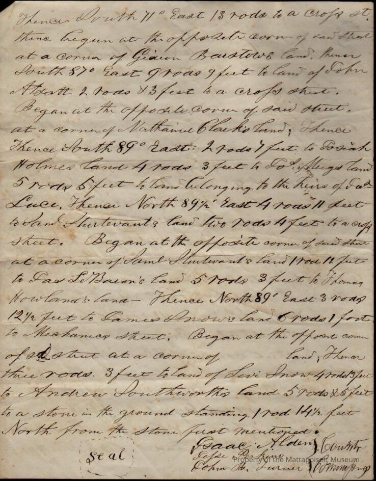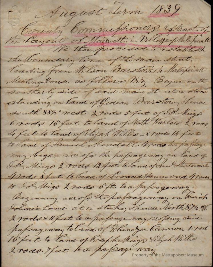 County Commissioners (Isaac Alden, Jesse Perkins, John B. Turner) extract of the layout of Main Street in the Village of Mattapoisett.Collection
