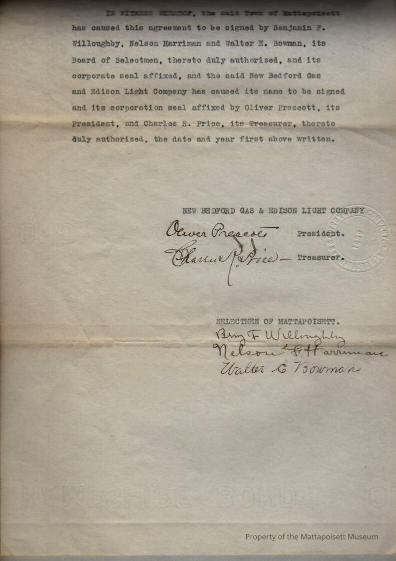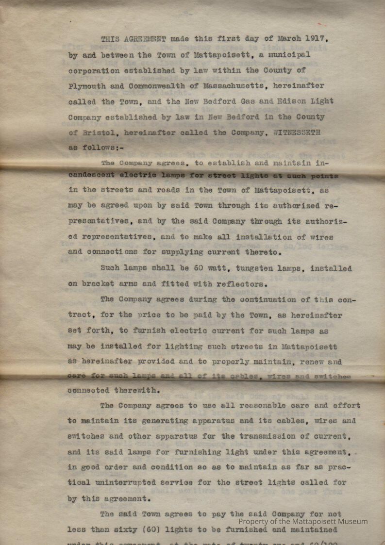 Agreement between the Town of Mattapoisett and New Bedford Gas and Edison Light Company to "establish and maintain incandescent electric lamps for street lights" in Town of Mattapoisett.Collection