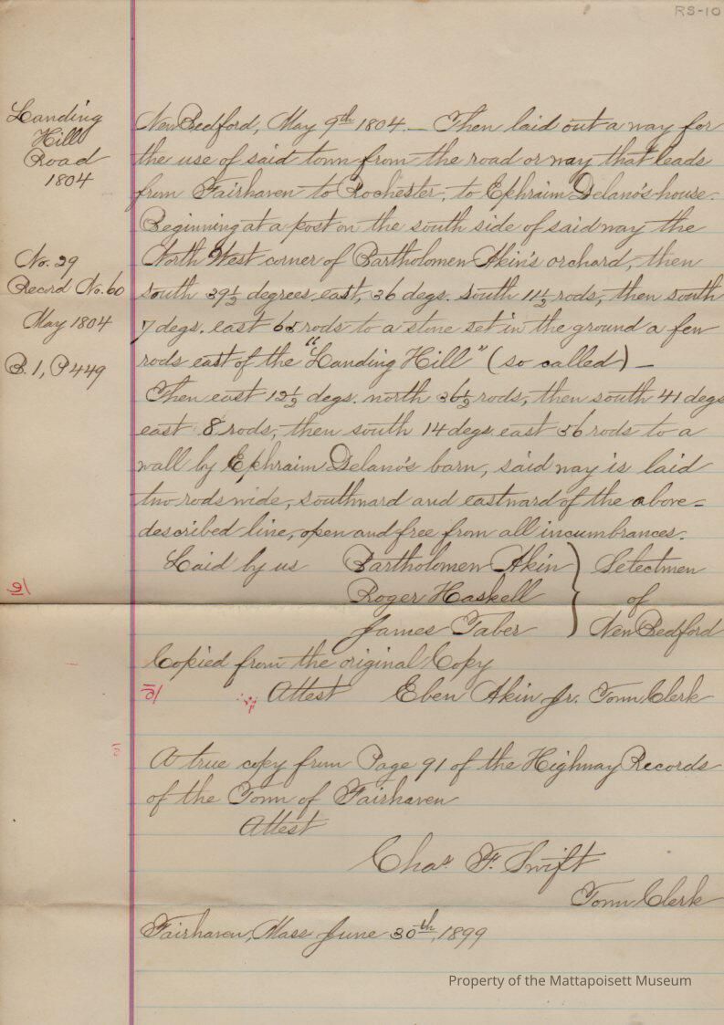Landing Hill Road between Fairhaven and Rochester. Record No. 60. Book 1, page 449.Collection
