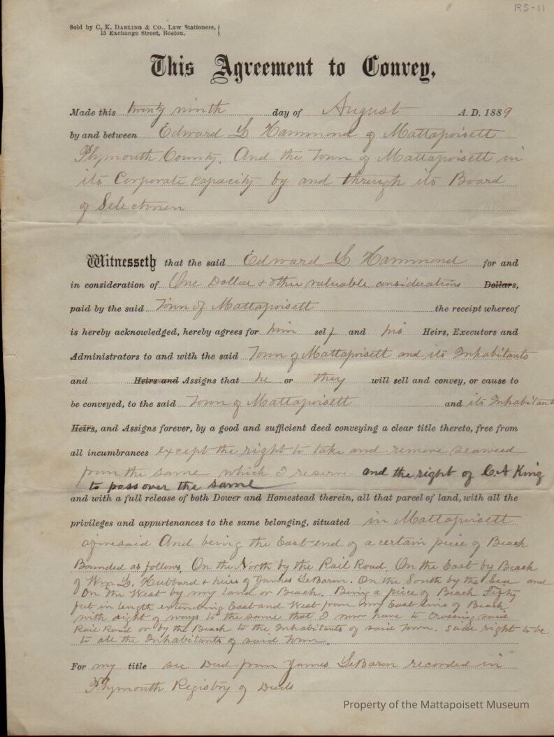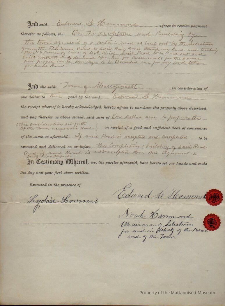 Agreement between Edward L. Hammond and the Town of Mattapoisett for road access to beach (and seaweed).Collection