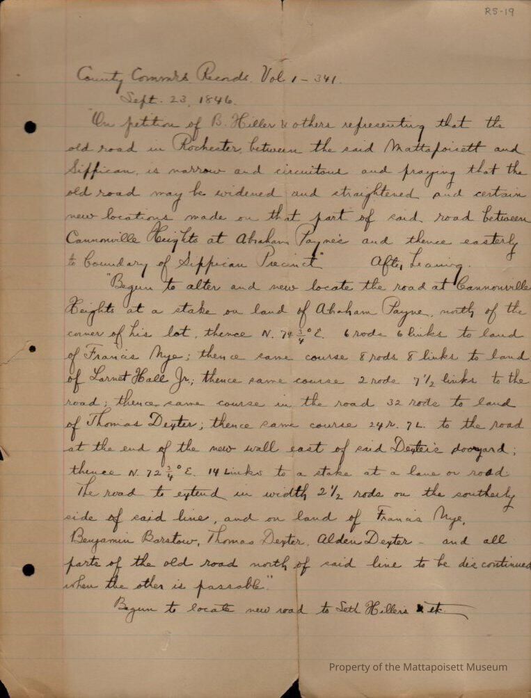 Petition of B. Hiller and others, to widen and straighten a narrow and circuitous road between Mattapoisett and Sippican. Records Vol 1-341. Handwritten transcription.Collection