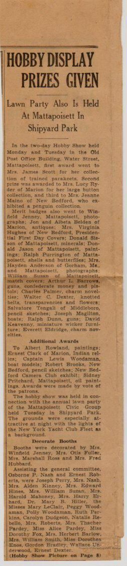 Hobby Display Prizes Given: Lawn Party Also Is Held At Mattapoisett In Shipyard ParkCollection