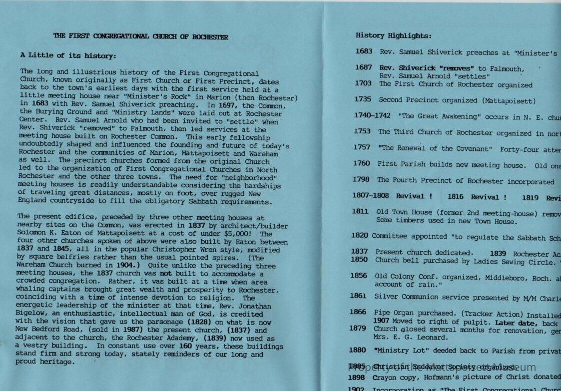 A little history of the First Congregational Church of Rochester.Collection