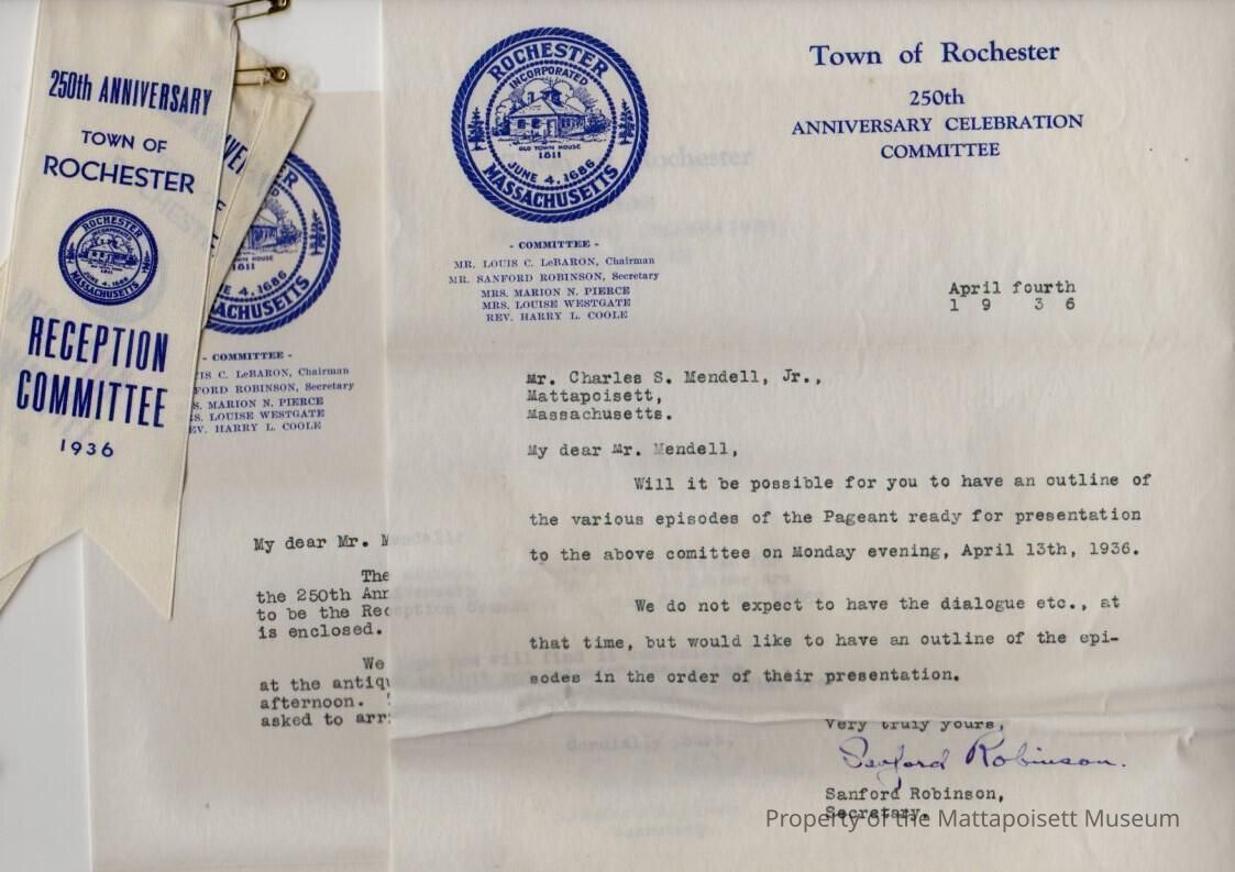 Letters to Charles Mendell from Sanford Robinson, Town of Rochester 250th celebration committee. Robinson requesting outline for Pageant. Reception Committee ribbons.Collection