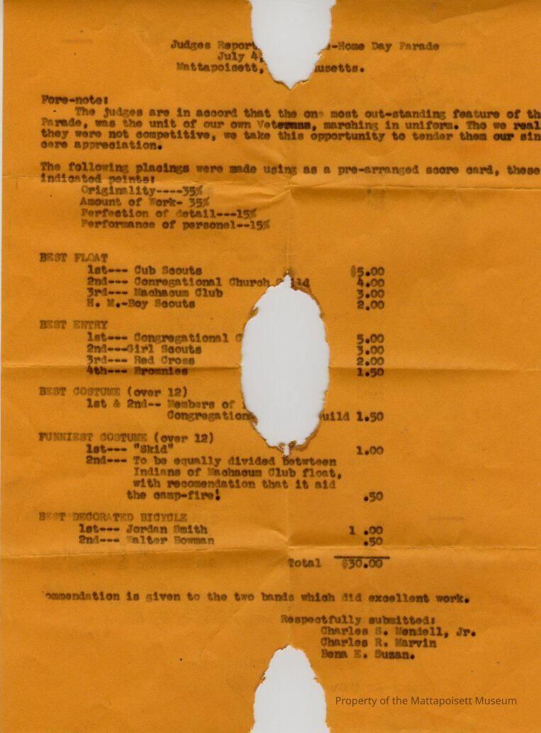July 4th []-Home Day Parade Judge Report for Best Float, Entry, Costume, Funniest Costume, Decorated Bicycle. Submitted by Charles S. Mendell, Charles R. Marvin, Benjamin E. Suzan.Collection
