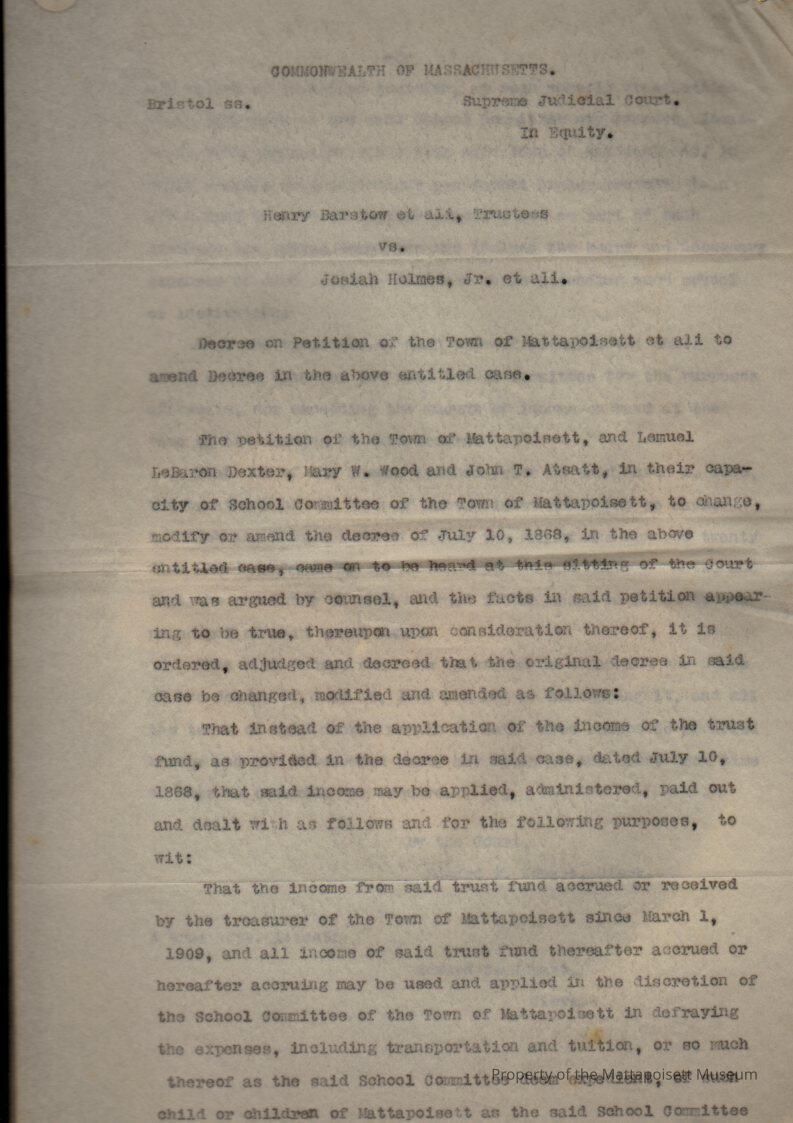 Supreme Judicial Court in equity, Henry Barstow et al, trustees vs. Josiah Holmes Jr. et al. Petition to amend decree. (School Committee, trust fund.)Collection