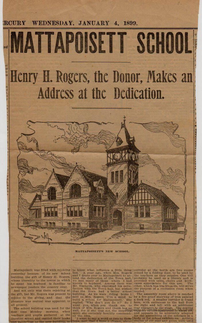 Mercury picture "Mattapoisett School" Henry H. Rogers, the Donor, Makes an Address at the Dedication. Drawing of "new school", Center SchoolCollection