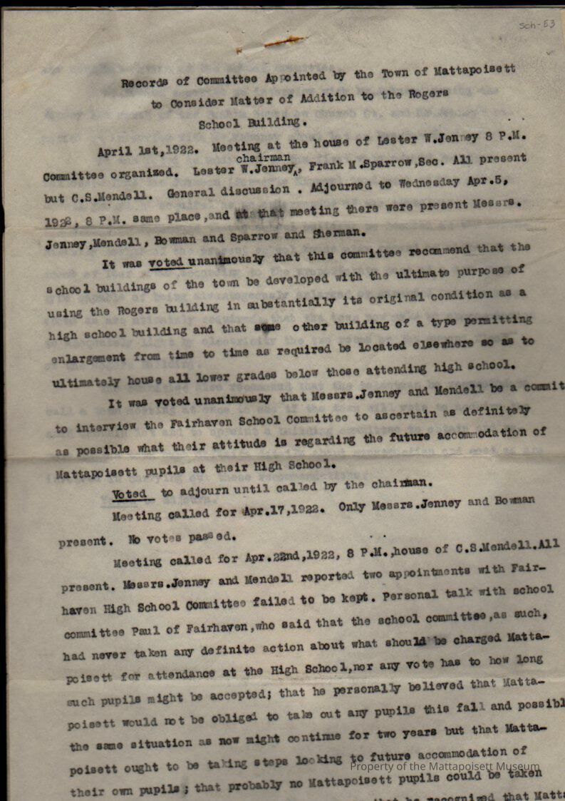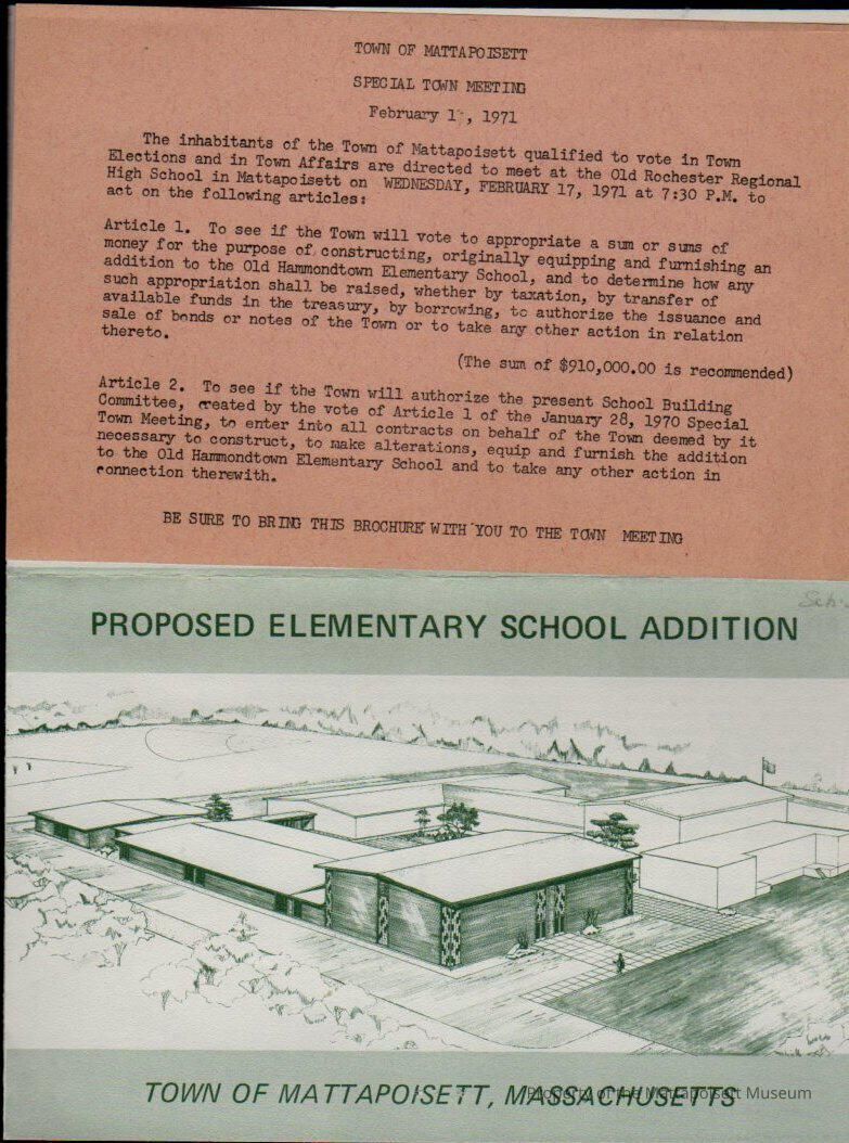 School addition renovations. Special Town Meeting warrant to vote on an addition to Old Hammondtown Elementary School and to authorize School Building Committee to enter contracts. Old Rochester Regional Junior/Senior High School. Mattapoisett Center School proposed additions. Records of Committee appointed by the Town of Mattapoisett to consider matter of addition to the Rogers School Building.Collection