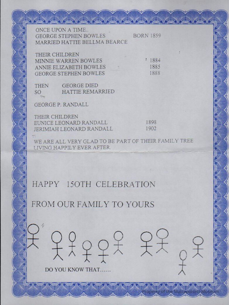 Invitation flyer for the 150th celebration of the George Stephen Bowles family.Collection