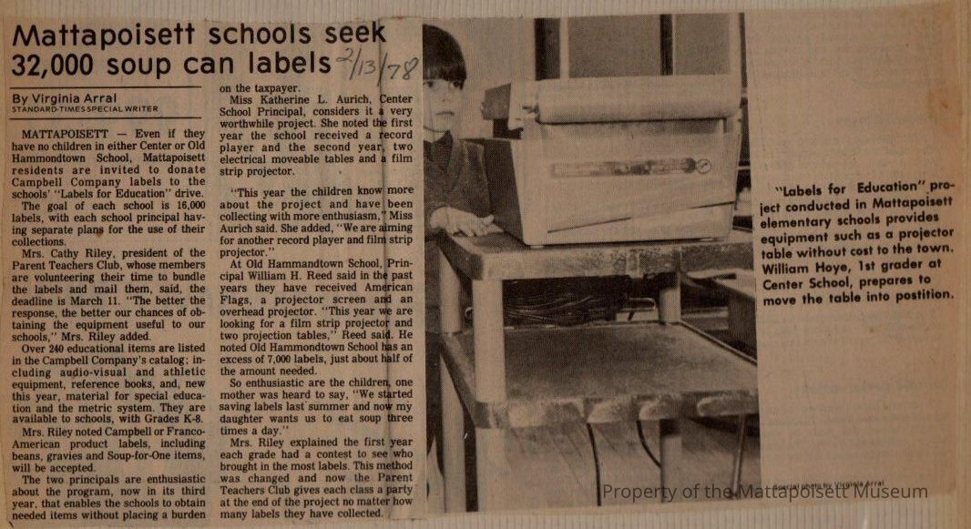 Standard-Times article "Mattapoisett schools seek 32,000 soup can labels. Request to residents to save Campbell's Soup Labels for Education for Center and Old Hammondtown Schools.Collection