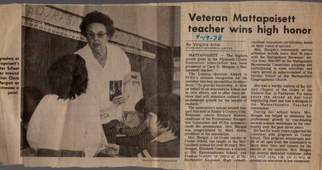 Standard-Times article "Veteran Mattapoisett teacher wins high honor", Clara D. Morgan given the Loretta Quinlan Award.Collection