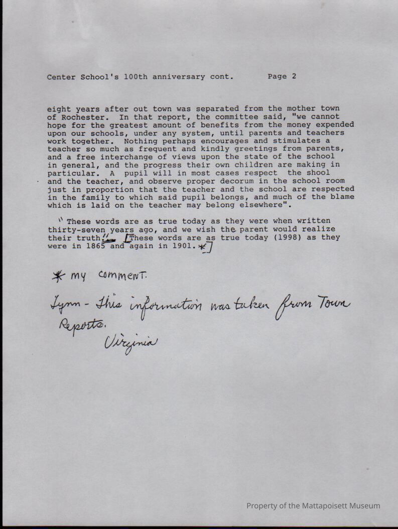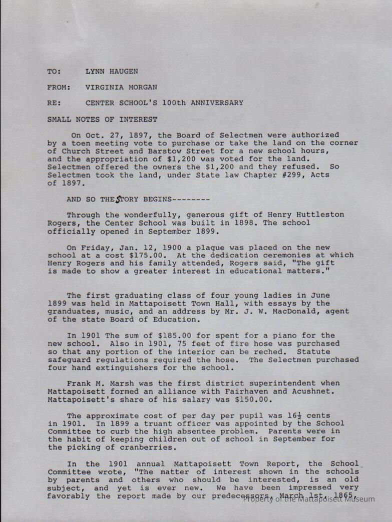Small notes of interest of Center School's 100th Anniversary. Information taken from Town Reports by Virginia Morgan to Lynn Haugen.Collection