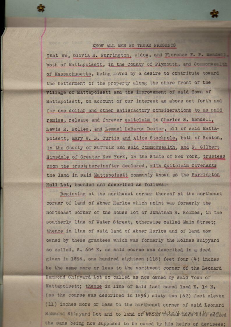 Quitclaim deed, into a trust, Purrington Hall Lot from Olivia H. Purrington and Florence F. P. Mendell. Charles S. Mendell, Lewis R. Bolles, Lemuel LeBaron Dexter, Mary W. B. Curtis, Alice Stackpole and F. Gilbert Hinsdale as trustees.Collection