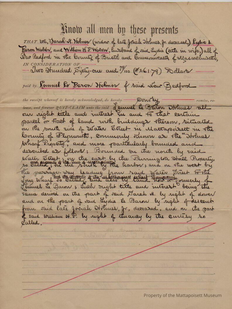 Deed from Sarah A. Holmes, Lydia LeBaron Walker and William H. P. Walker to Lemuel LeBaron Holmes for property on the south side of Water Street known as "Holmes Wharf Property"Collection