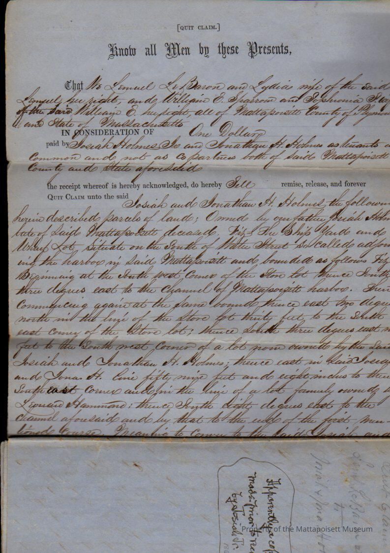 Quitclaim deed Lemuel LeBaron and Lydia, William E. Sparrow and Jophenia to Josiah Holmes Jr. and Jonathan H. Holmes for Shipyard and Wharf lots.Collection