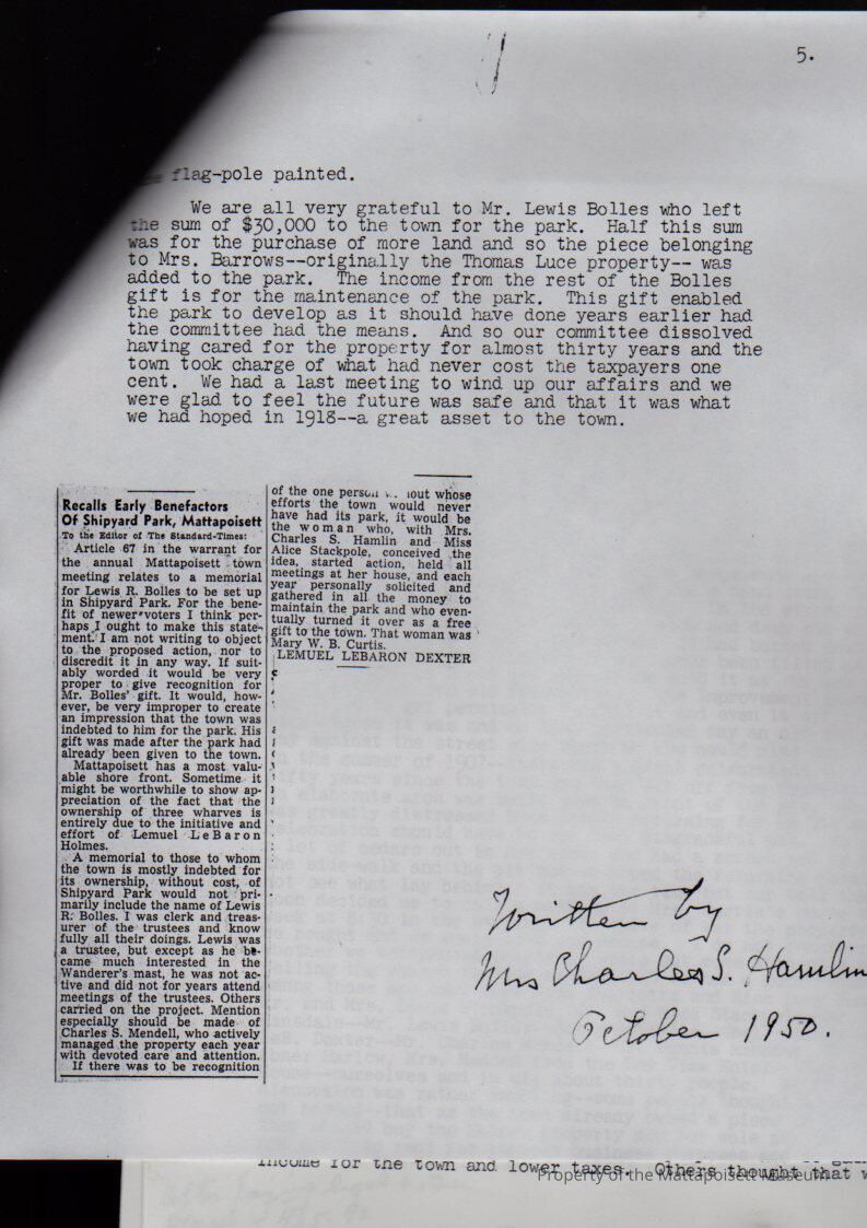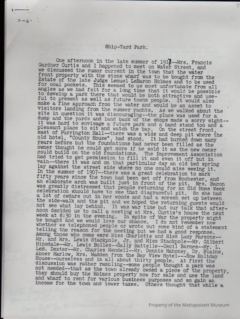 Shipyard Park articles, one written by Mrs. Charles S. Hamlin, October 1950, Standard-Times article "Recalls early benefactors of Shipyard Park, Mattapoisett" by Lemuel LeBaron Dexter.Collection
