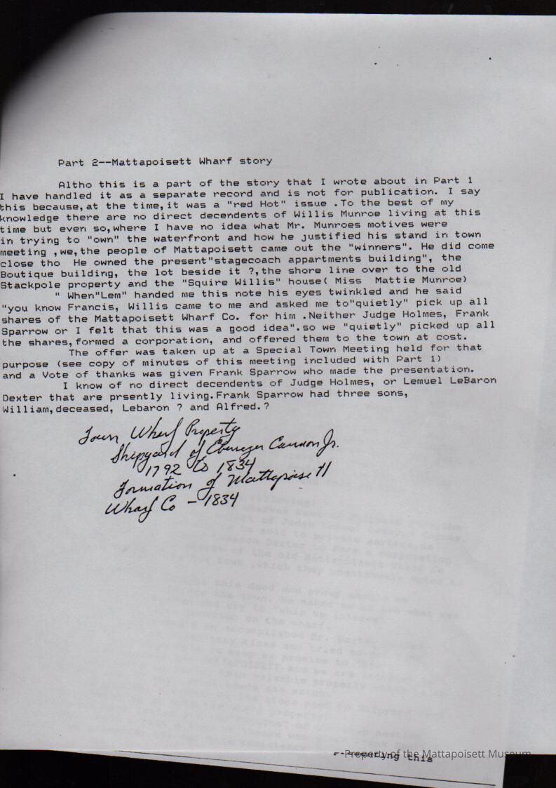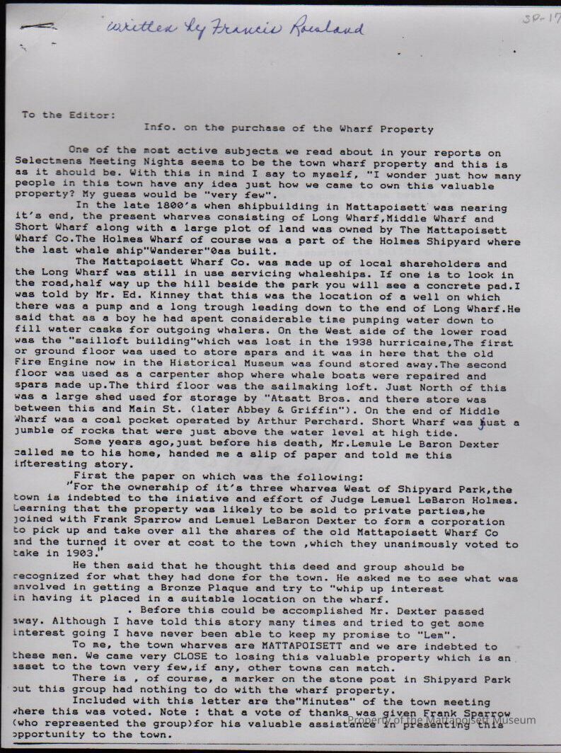 Letter to "The Editor", written by Francis Rowland "Info on the purchase of the Wharf Property"Collection