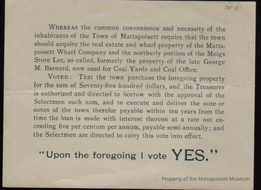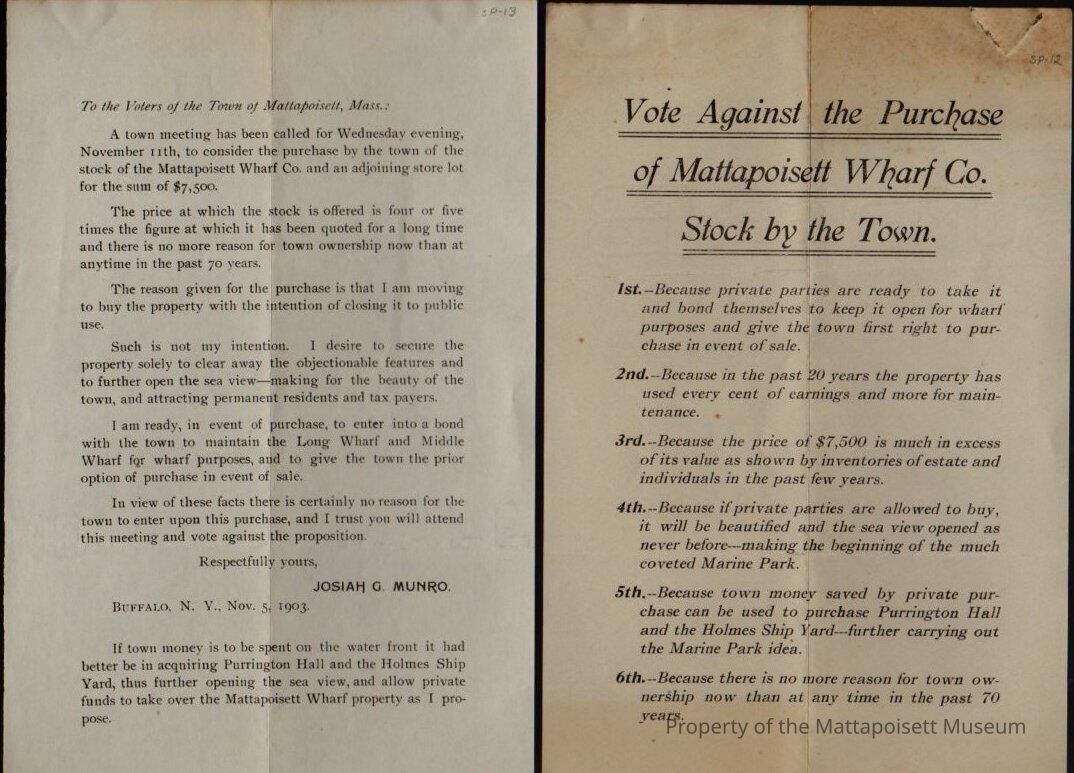 Appeal to the Voters of the Town of Mattapoisett from Josiah G. Munro, to vote against the proposition for the town to purchase Mattapoisett Wharf (Long Wharf and Middle Wharf), alternative for town to purchase Purrington Hall and Holmes Shipyard to carry out "Marine Park" idea. Second appeal to vote that the town purchase the property (and Meigs Store Lot).Collection