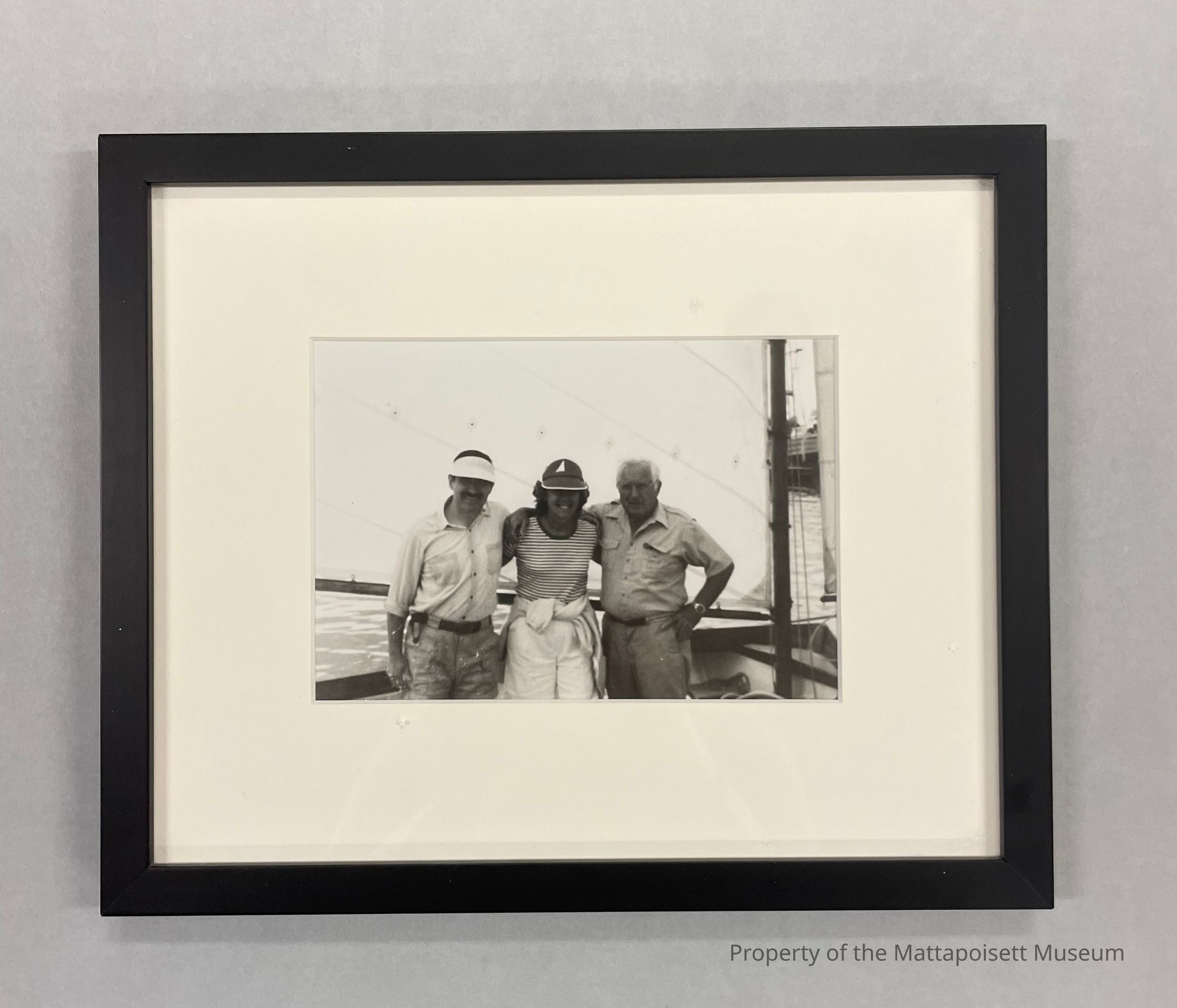 A photograph of Robert Hauser, Nancy Clark, and Albert Hauser on a 12 1/2 Herreshoff Sailboat in the mid 1980sPhotograph Details
