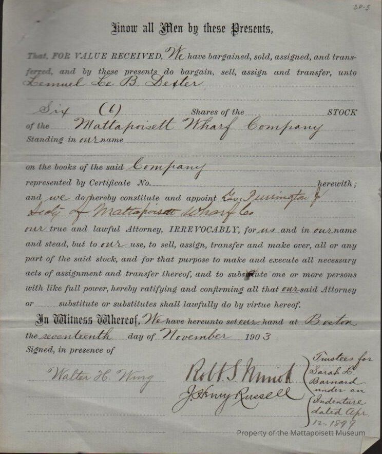 Sale of six shares of Mattapoisett Wharf Company to Lemuel LeBaron DexterCollection