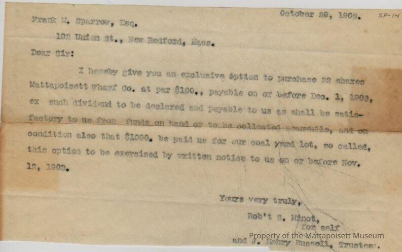 Letter to Frank M. Sparrow, esq. from Rob't S. Minot and J. Henry Russell, exclusive option to purchase Mattapoisett Wharf Co. on or before Dec. 1, 1903.Collection