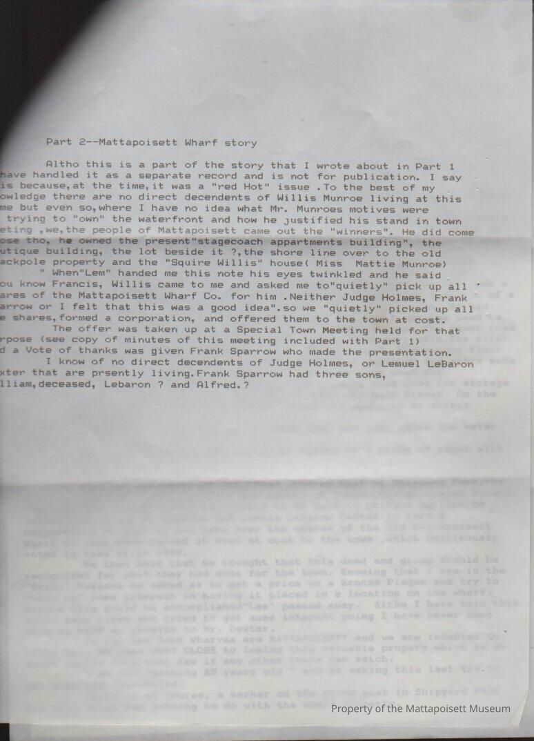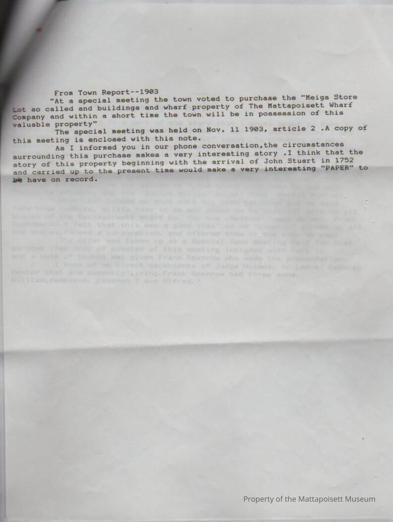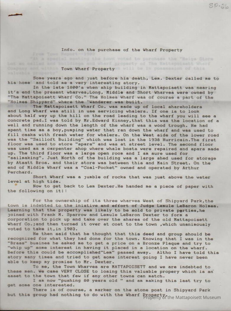 Information on the purchase of the Wharf Property as told by Lemuel LeBaron Dexter and from town report, 1903.Collection