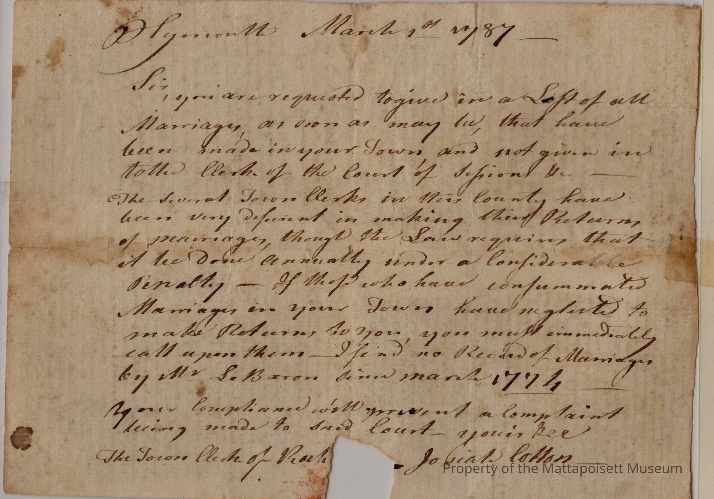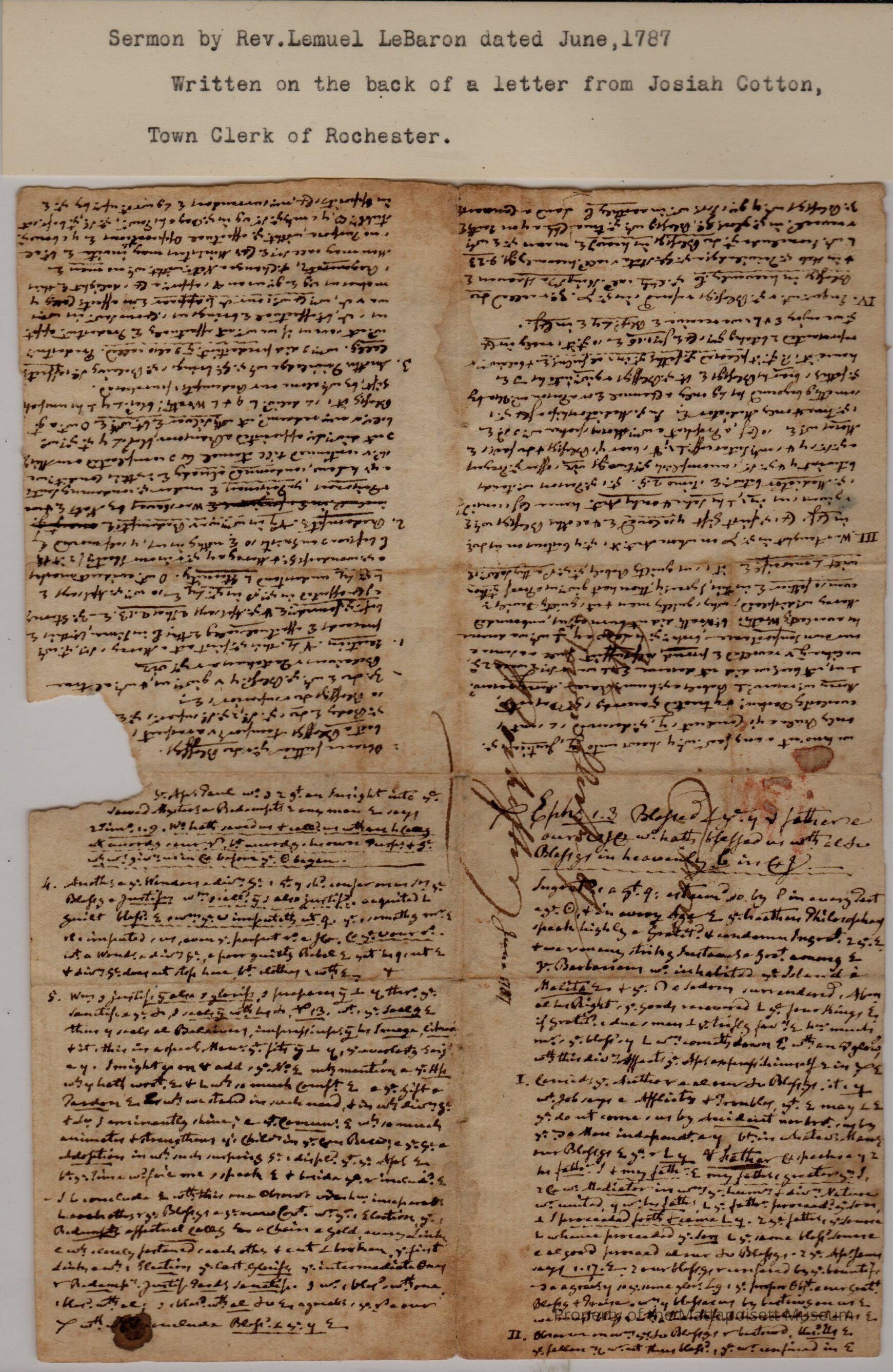 Rev. Lemuel LeBaron sermon, written on the back of a letter from Josiah Cotton (Town Clerk of Rochester, March 1st, 1787). Ephesians 1:3Collection