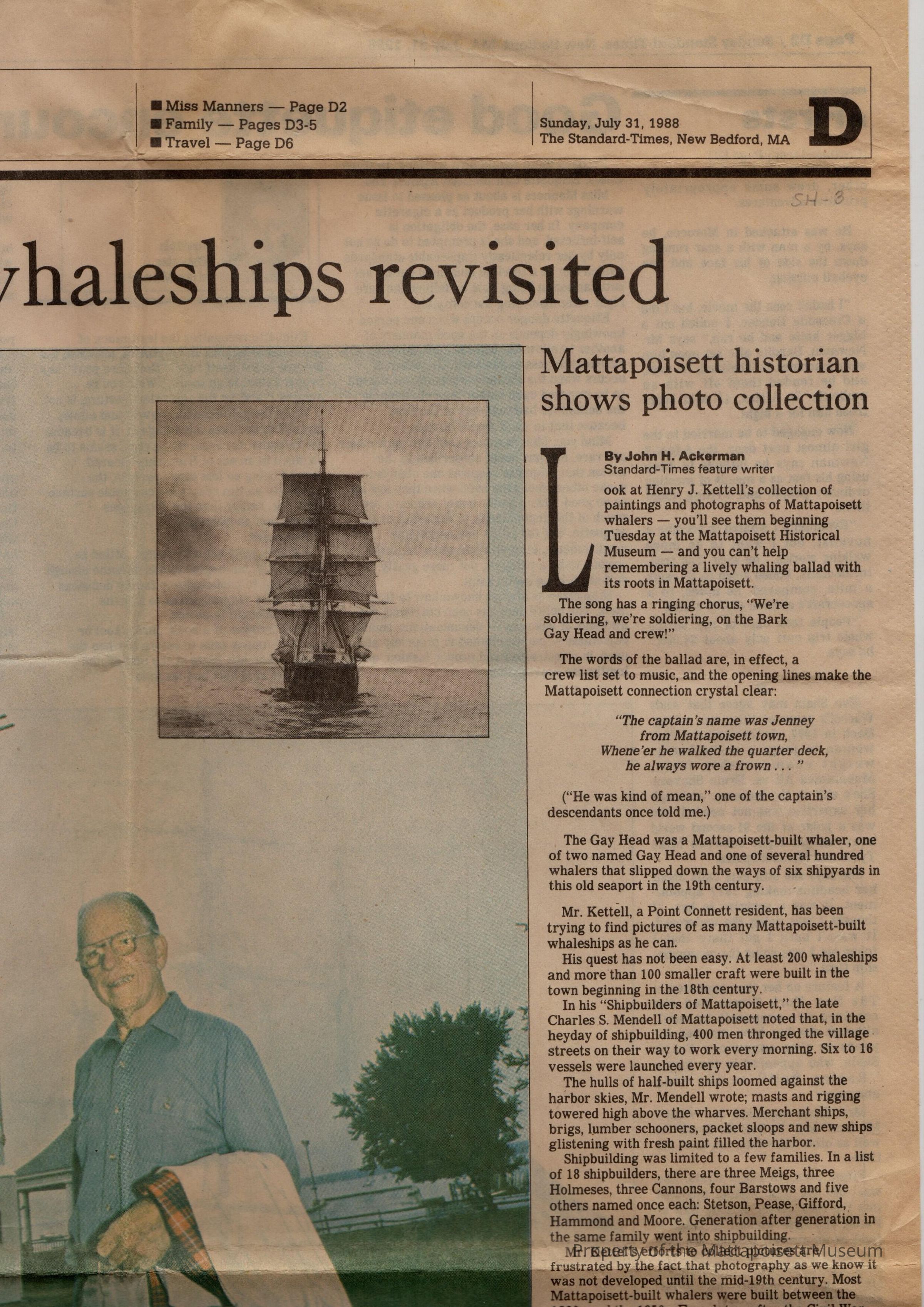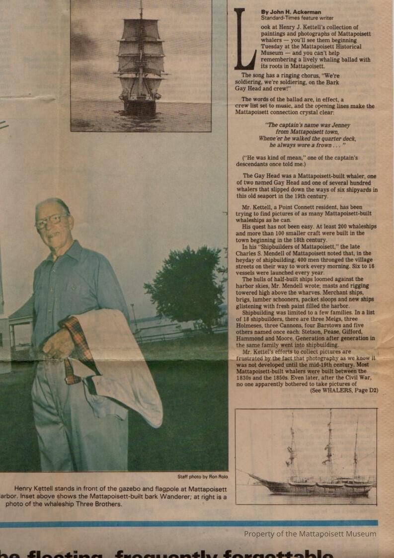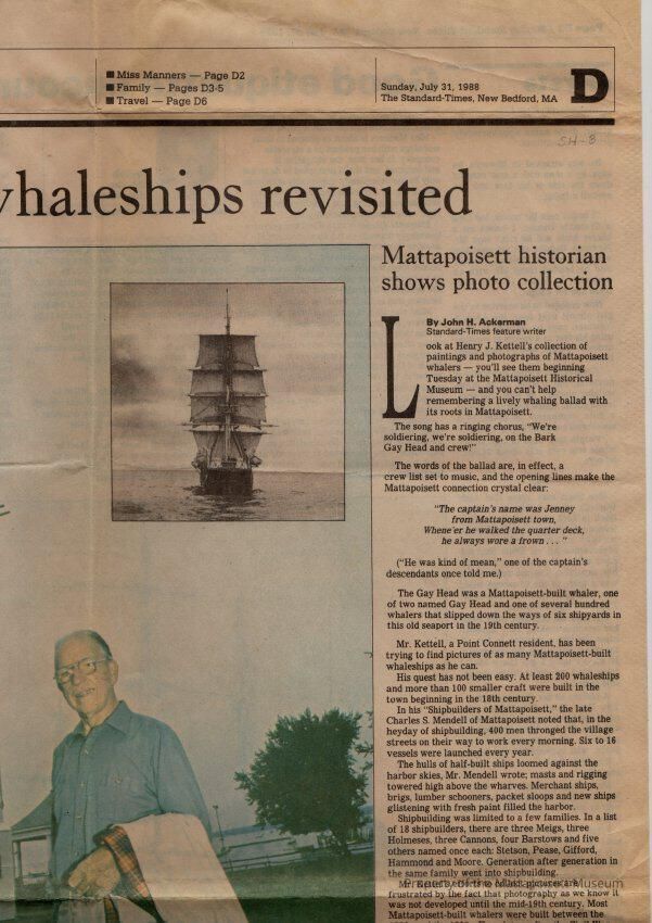 Standard-Times article "Whaleships revisited" Mattapoisett historian shows photo collection. Henry J. Kettell paintings and photos at Mattapoisett Historical Museum.Collection