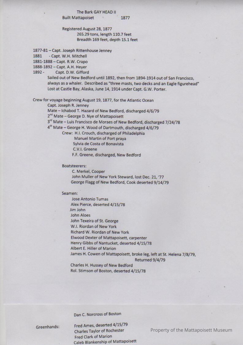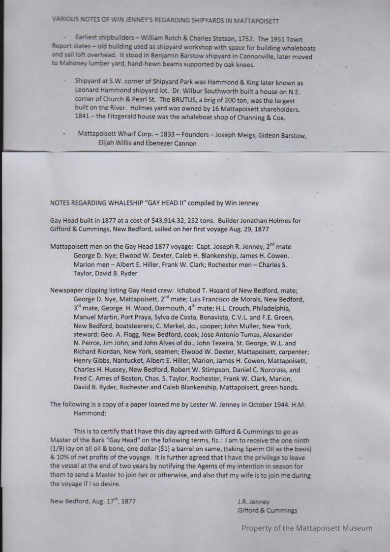 Various notes of Win Jenney's regarding shipyards in Mattapoisett; "Gay Head II", etc.Collection