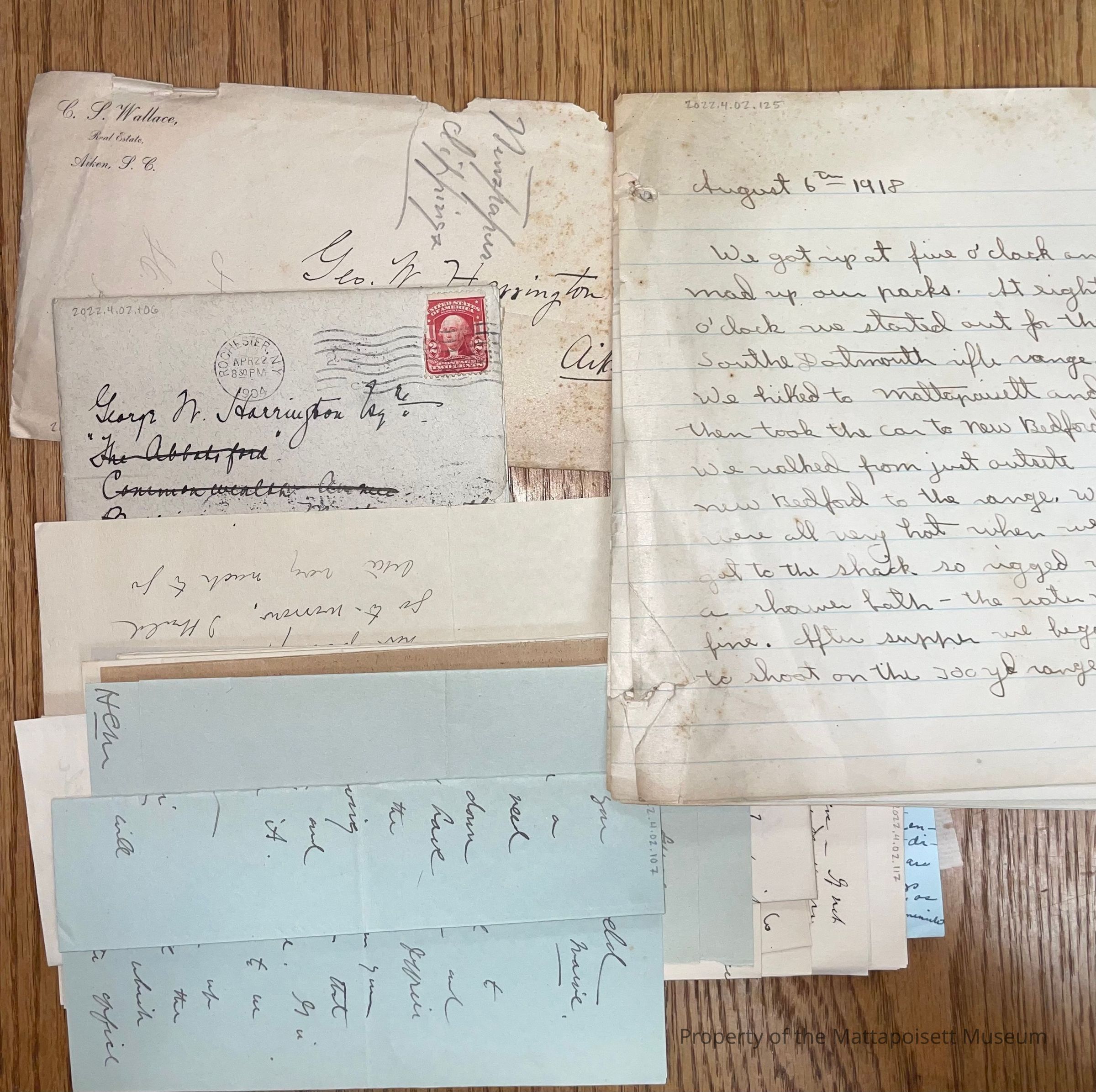 Everything in the collection (letters, manuscripts, typewriter, wedding dress, documents, books) was found in the attic of 18 Pine Island Road, Mattapoisett in 2022 and donated by the new house owners. This house was owned by Harrington and his wife. They subdivided the land and created Winnatuxett Beach Rd. George and Marian Harrington were the first couple ever married in St. Philips Church on Water Street. They were married in 1898.Created By
