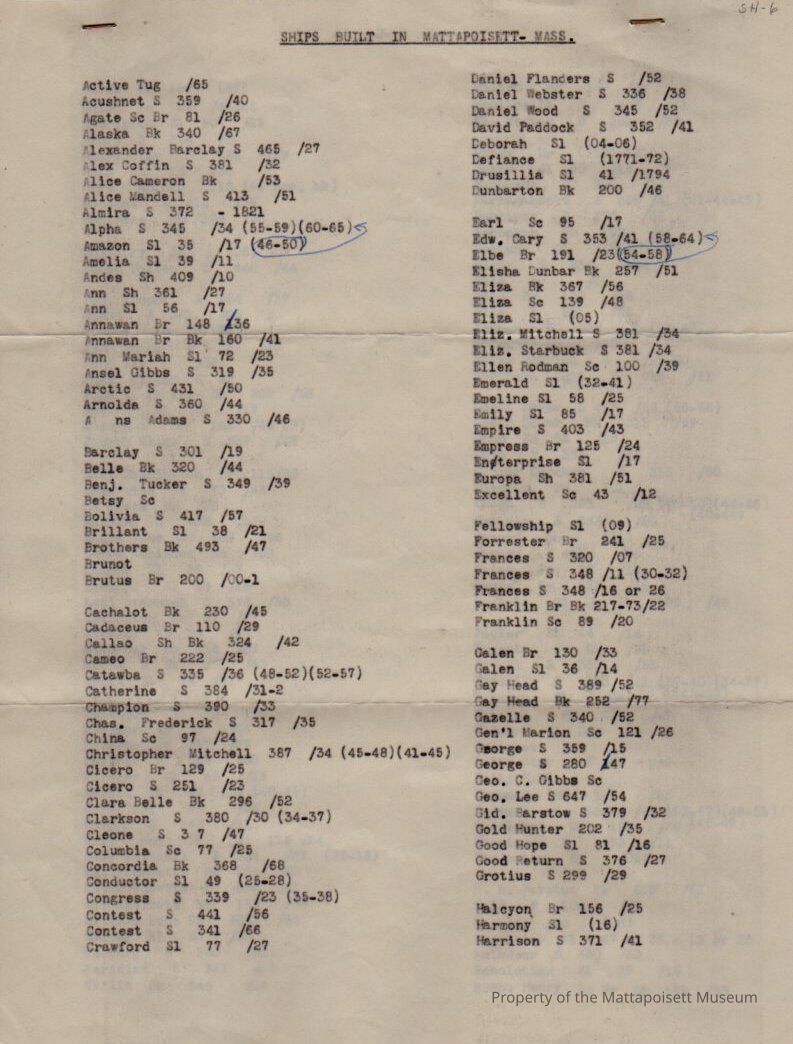 List of Ships Built in Mattapoisett, Mass.Collection