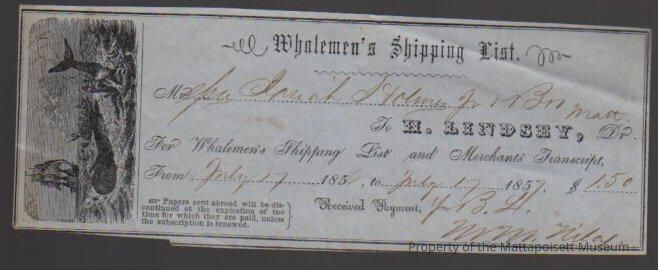 Receipt for Whalemen's Shipping List subscription for [] Holmes Jr.Collection