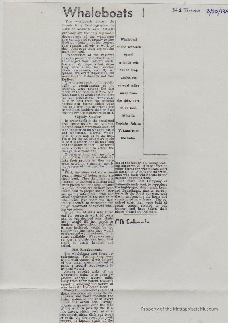 Standard-Times copy of article "Whaleboats" Whaleboat of the research vessel Atlantis sets out to drop explosives several miles away from the ship, hove to in mid-Atlantic. Captain Adrian V. Lane is at the helm.Collection