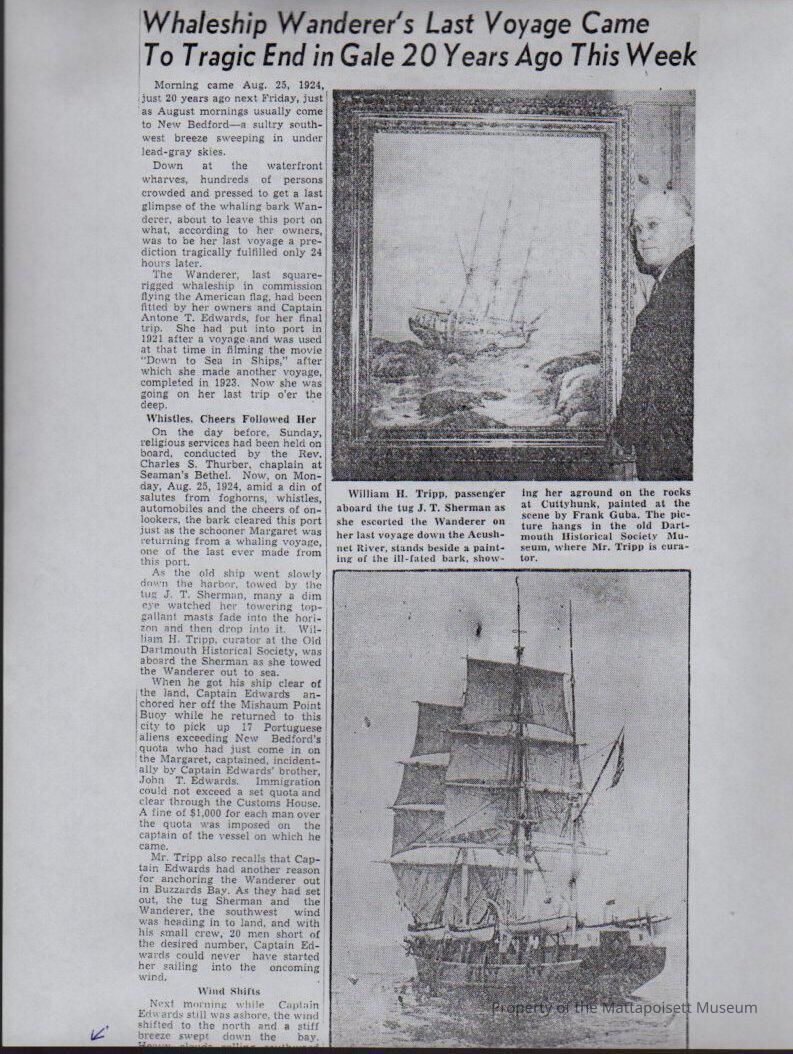 Newspaper article "Whaleship Wanderer's last voyage came to tragic end in gale 20 years ago this week". Picture of William H. Tripp, who was part of tug that escorted the Wanderer on her last voyage down the Acushnet, standing by picture of Wanderer on tCollection