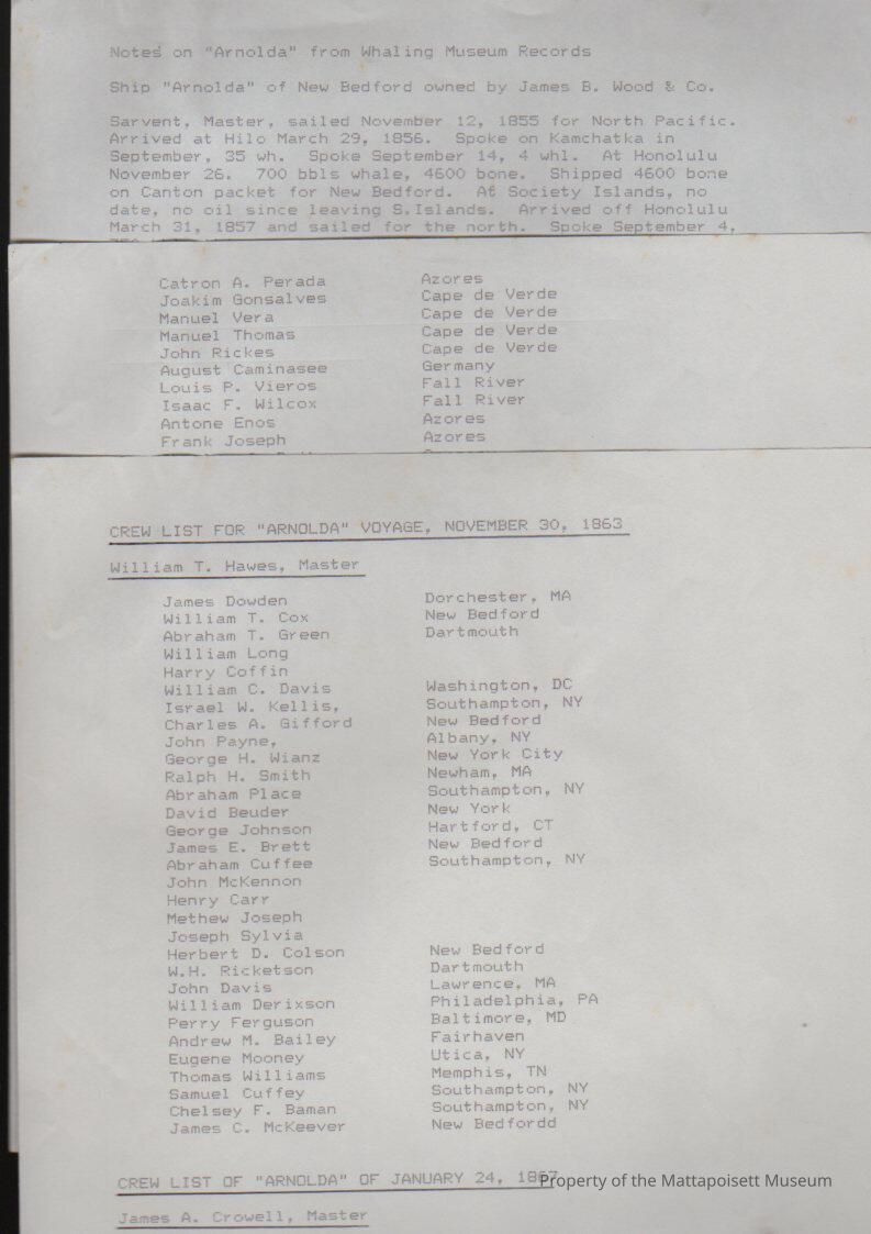 Notes and Crew list for "Arnolda" voyage, November 30, 1863. William T. Hawes, Master.Collection