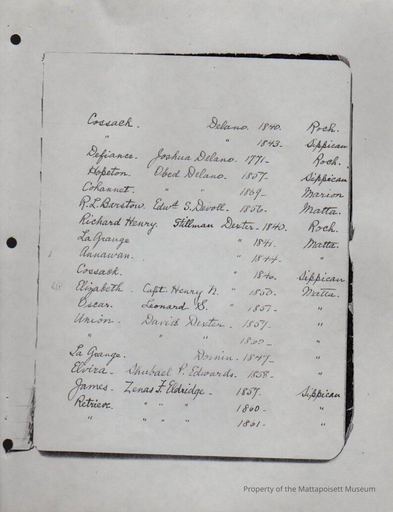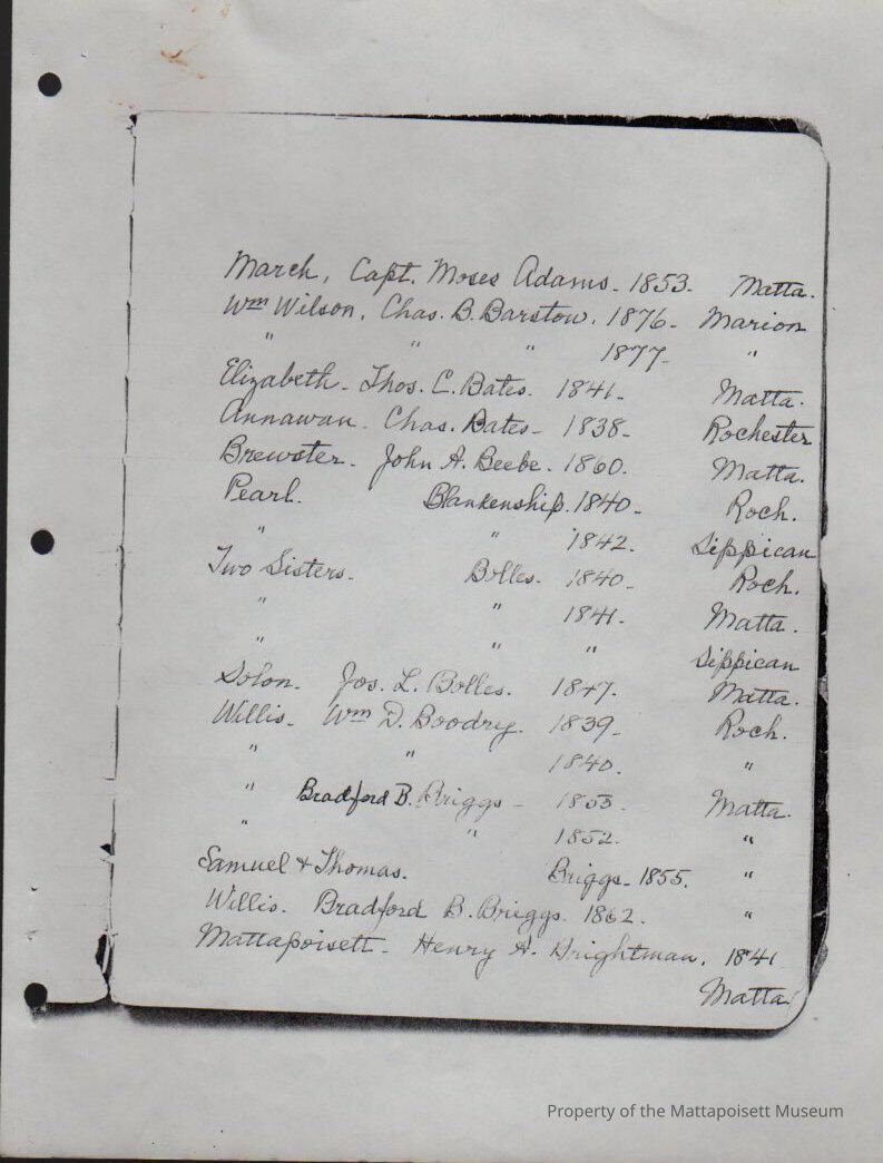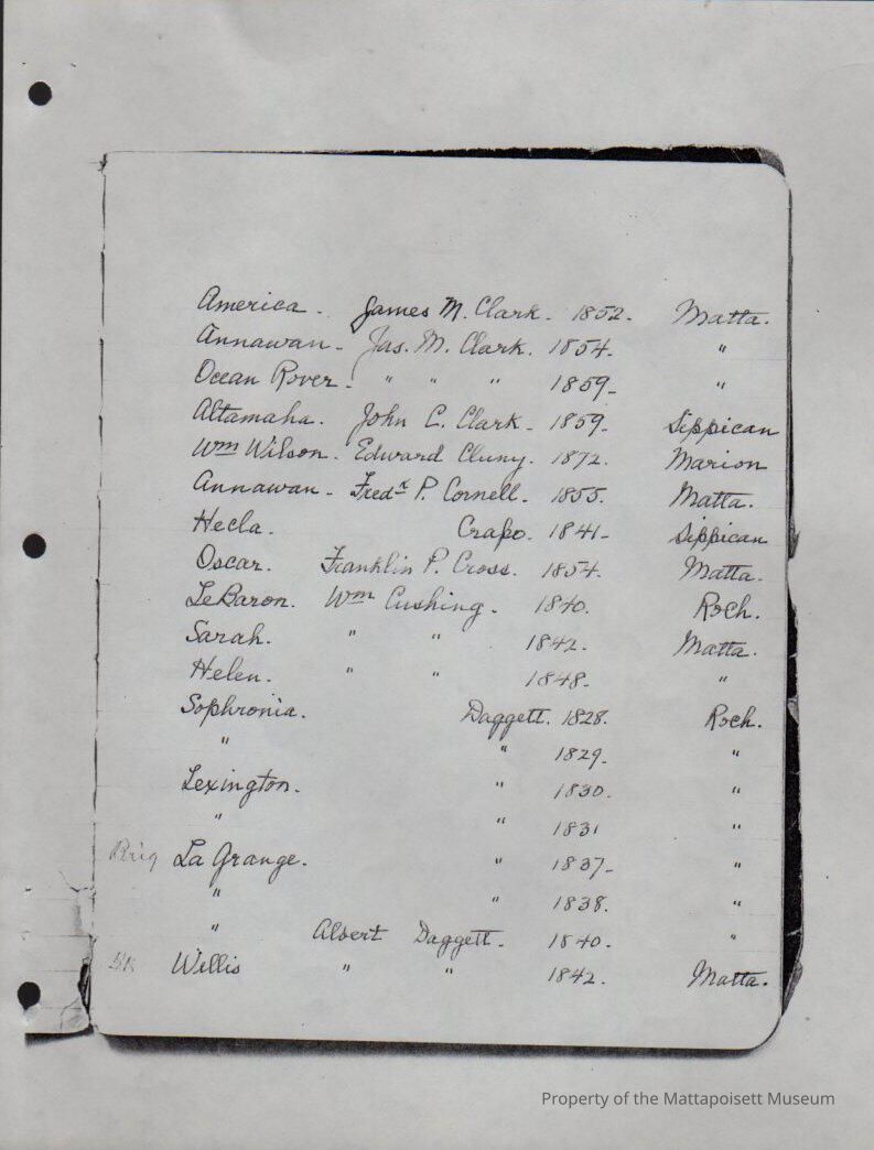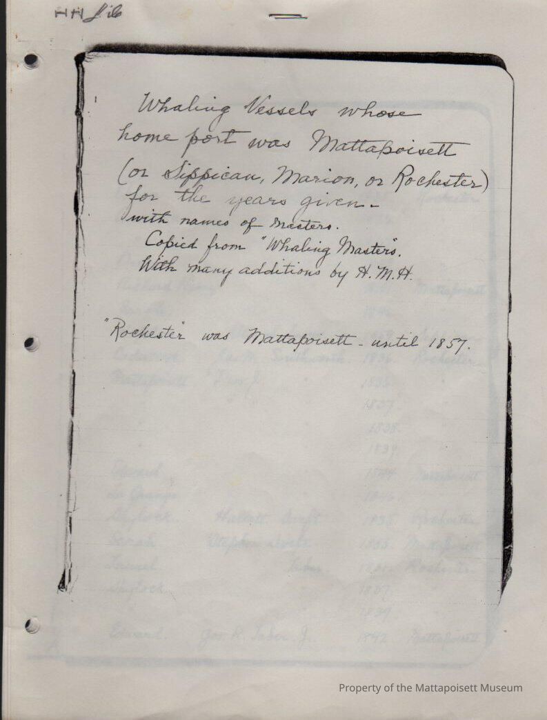 Copy of notes of Whaling Vessels whose home port was Mattapoisett (or Sippican/Marion or Rochester) for the years given with names of masters, copied from "Whaling Master" , with additions by H. M. H.Collection